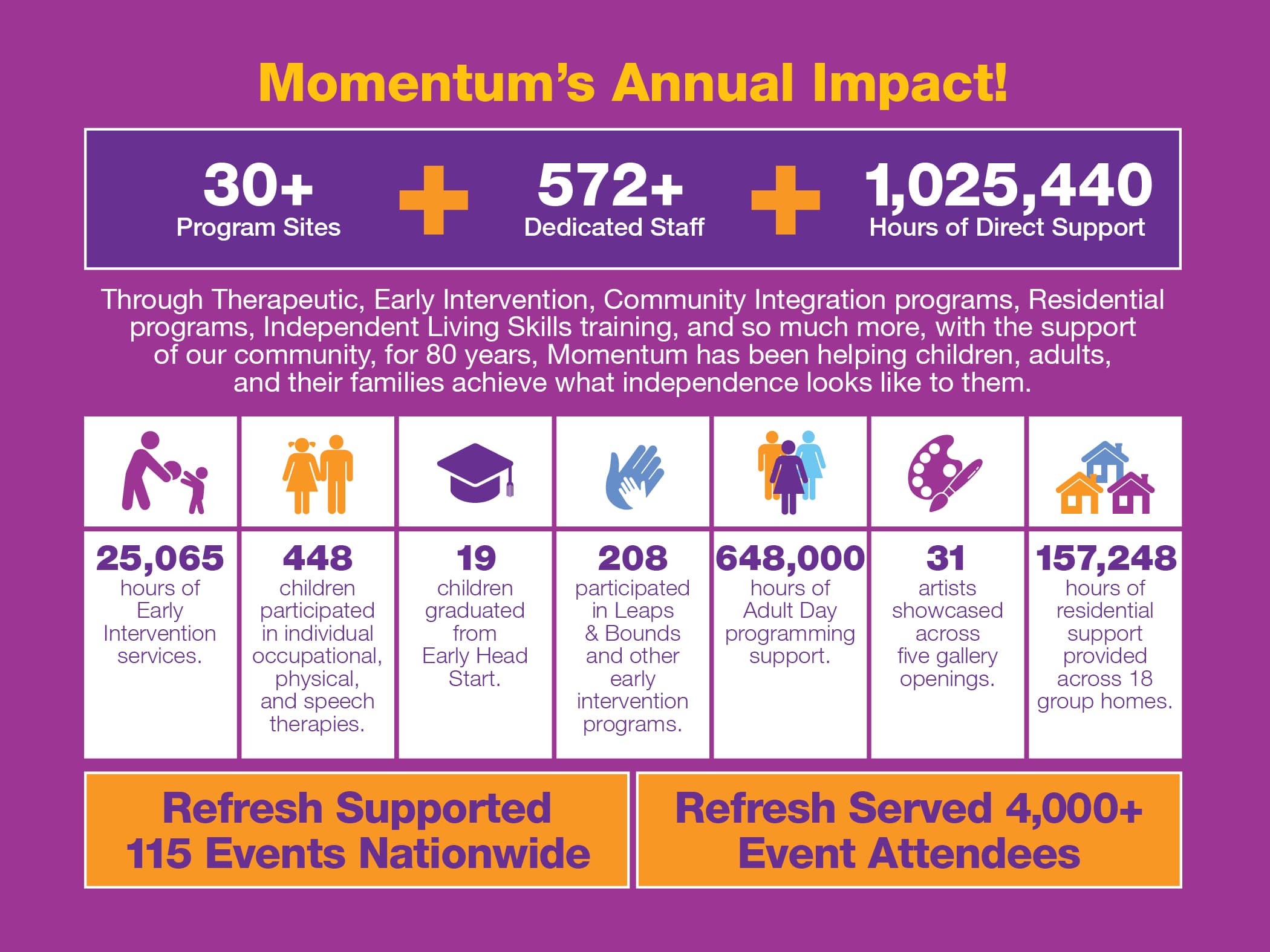 In 1945, a small group of dedicated families banded together to form an organization providing critical community-based services for their children with disabilities when no services existed. Today, 80 years strong, Momentum provides a lifespan of services and programs to children, adults, and their families unlike any other. In pursuit of a vision where everyone has a sense of inclusion, access, and opportunity, we are dedicated to advancing the independence, productivity, and full citizenship of children and adults with disabilities and medical conditions. Through innovation, community integration, and advocates like you, Momentum continues to set the pace in creating space where people are defined by their gifts rather than by a diagnosis.